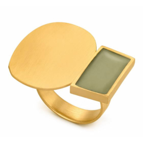 Anillo formado para dos formas geométricas imperfectas que se combinan de manera aleatoria. Pieza elaborada en metal mate con baño de oro de 24 K y esmalte de color verde.