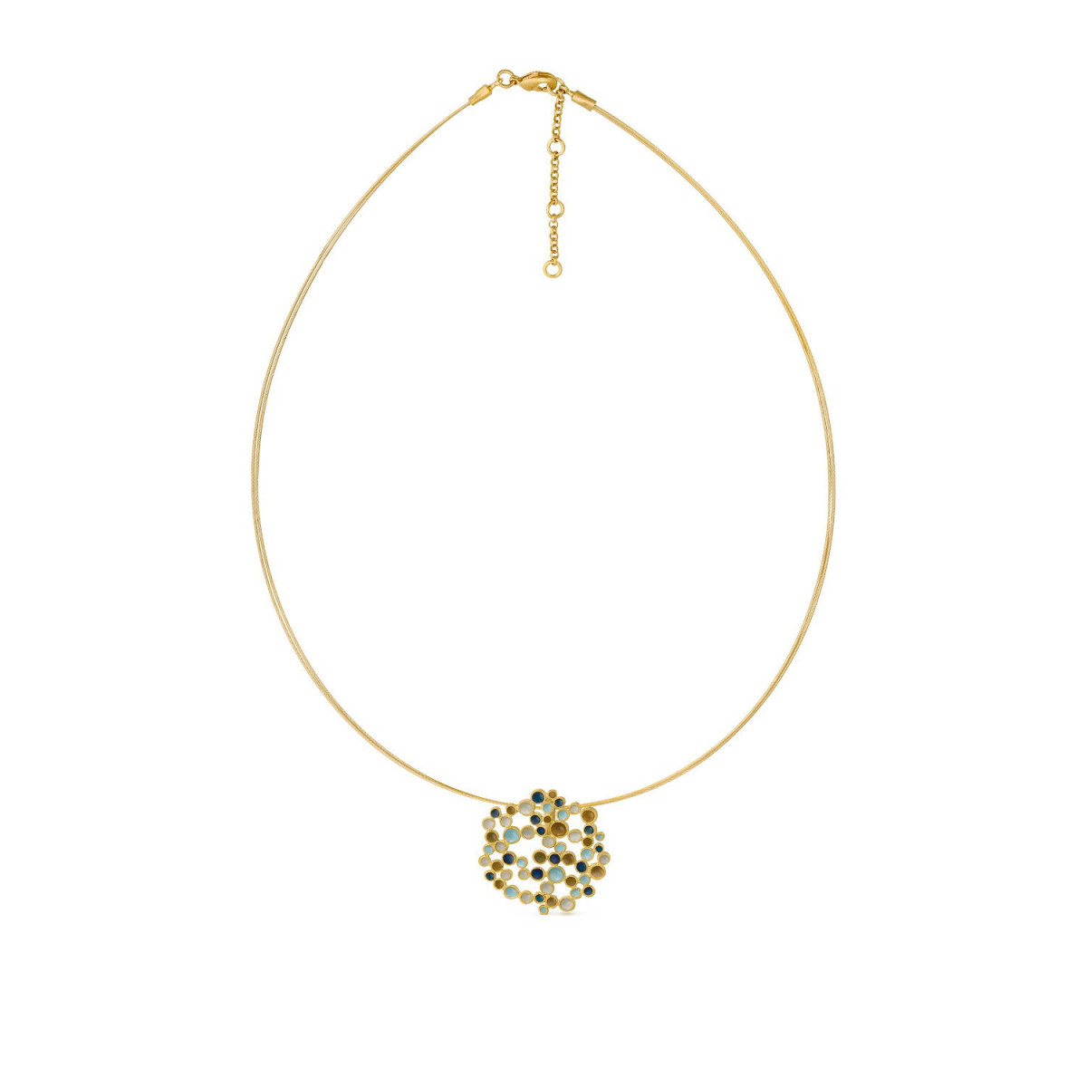 Collar con colgante pequeño en metal dorado con baño de oro de 24 K y esmalte frío en tonos azules. Cable de acero en color dorado y cierre con mosquetón y cadena de extensión.
