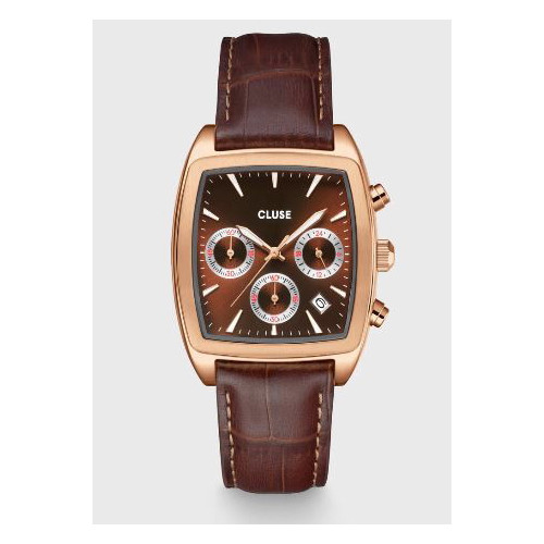 El reloj tonneau Quartaut Chrono para hombre cuenta con una caja de 35 mm de color oro rosa, una esfera de color marrón con 3 subesferas y una correa de 20 mm en piel de cocodrilo texturizada de color marrón.