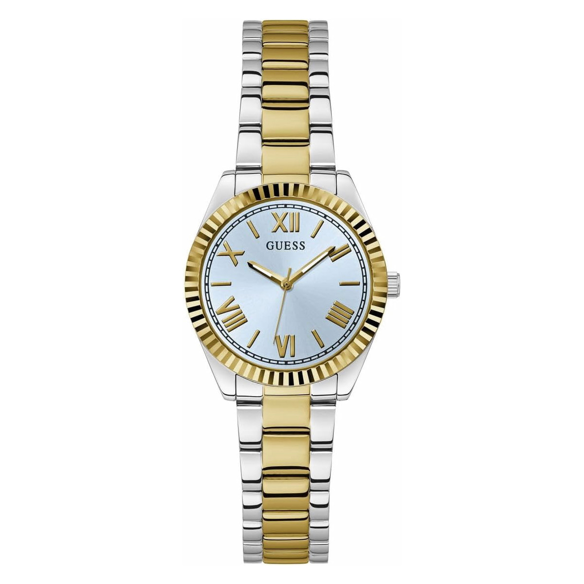 Este reloj Guess Mini Luna GW0687L4 orientado para mujer, tiene la caja de acero reciclado con forma de barril bicolor. Brazalete de acero bicolor, esfera color azul, bisel troquelado dorado. El cristal es mineral, el movimiento cuarzo y el display analógico. Diámetro: 30 mm. Funciones: Tres agujas. Impermeabilidad: 3 ATM. Tipo de cierre: Deployant. Garantia de tres años. Disfruta de tú reloj Guess.