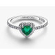 Todo corazón, todo brillo. Nuestro anillo en plata de primera ley se presenta con un cristal sintético elevado con forma corazón de color verde rodeado por un halo de pavé y la mitad del eje decorada con pavé.